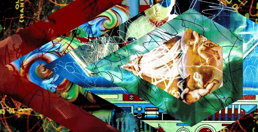 Wanting to develop these themes further, I layered stepped geometric triangle / diamond / hexagonal shapes. Initially keeping these stark and coloured, I then then masked the shapes around photographic elements. The angle of the hexagon-to-triangles give some sense of movement and the photos literally ‘break through’ these shapes. As a finishing touch, I included some scribble drawings from my 2 year old niece (I’ve wanted to include them in some work since she could hold a pencil). The Song is about taking in the world and streets of everyday passing life, amplifying the small and mundane to see the magic that’s all around us (at least that’s what I’ve gleaned from the lyrics!).