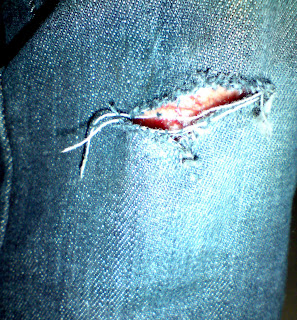 I thought nothing of my slightly grazed knee feeling until I locked down and saw the hole in my jeans’ knee and could feel a damp bit of blood. I didn’t want to look and felt it more prudent to just go home and forget about town.